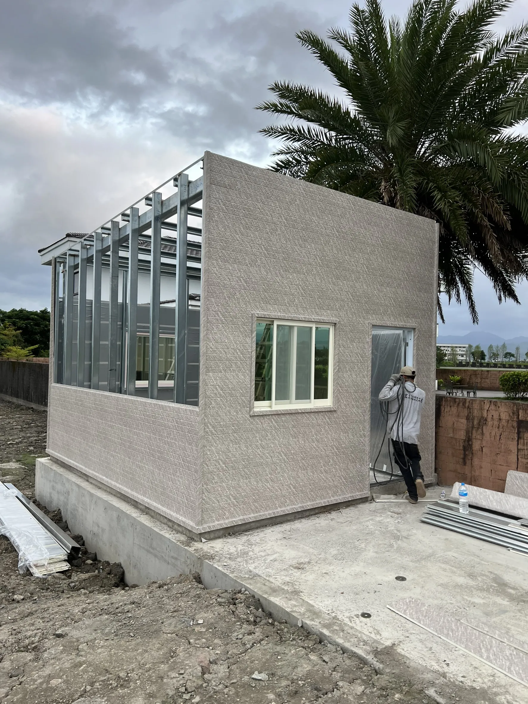 這次在宜蘭員山協助業主完成一間資材室外牆施作,主要以花崗岩風鍊石板材做外牆包覆,讓空間在實用之外,也多了更耐看的外觀質感。